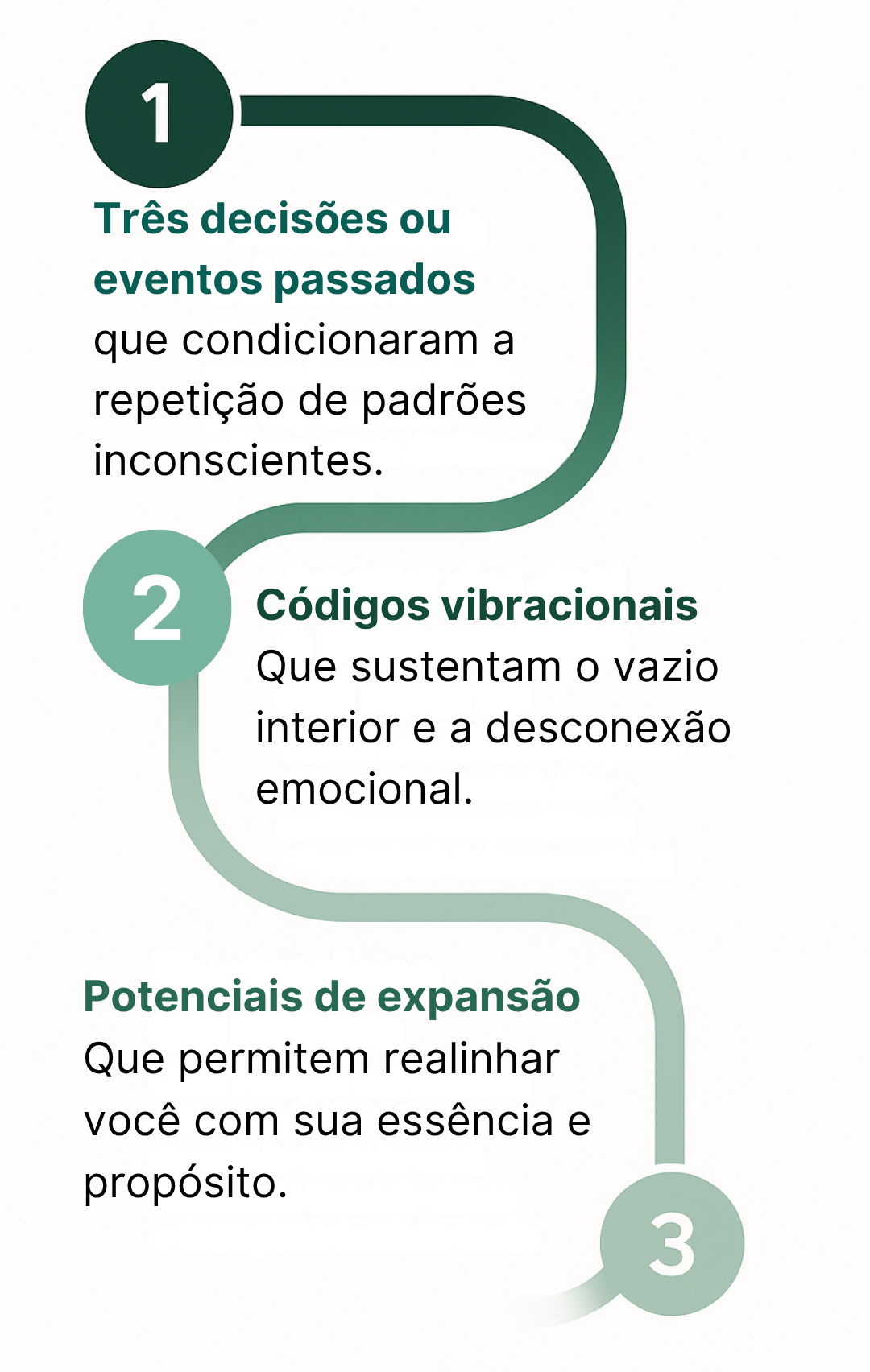 A análise revela as origens invisíveis das suas dores, padrões repetitivos e bloqueios emocionais, permitindo que você compreenda, libere e integre uma nova vibração de equilíbrio e propósito.